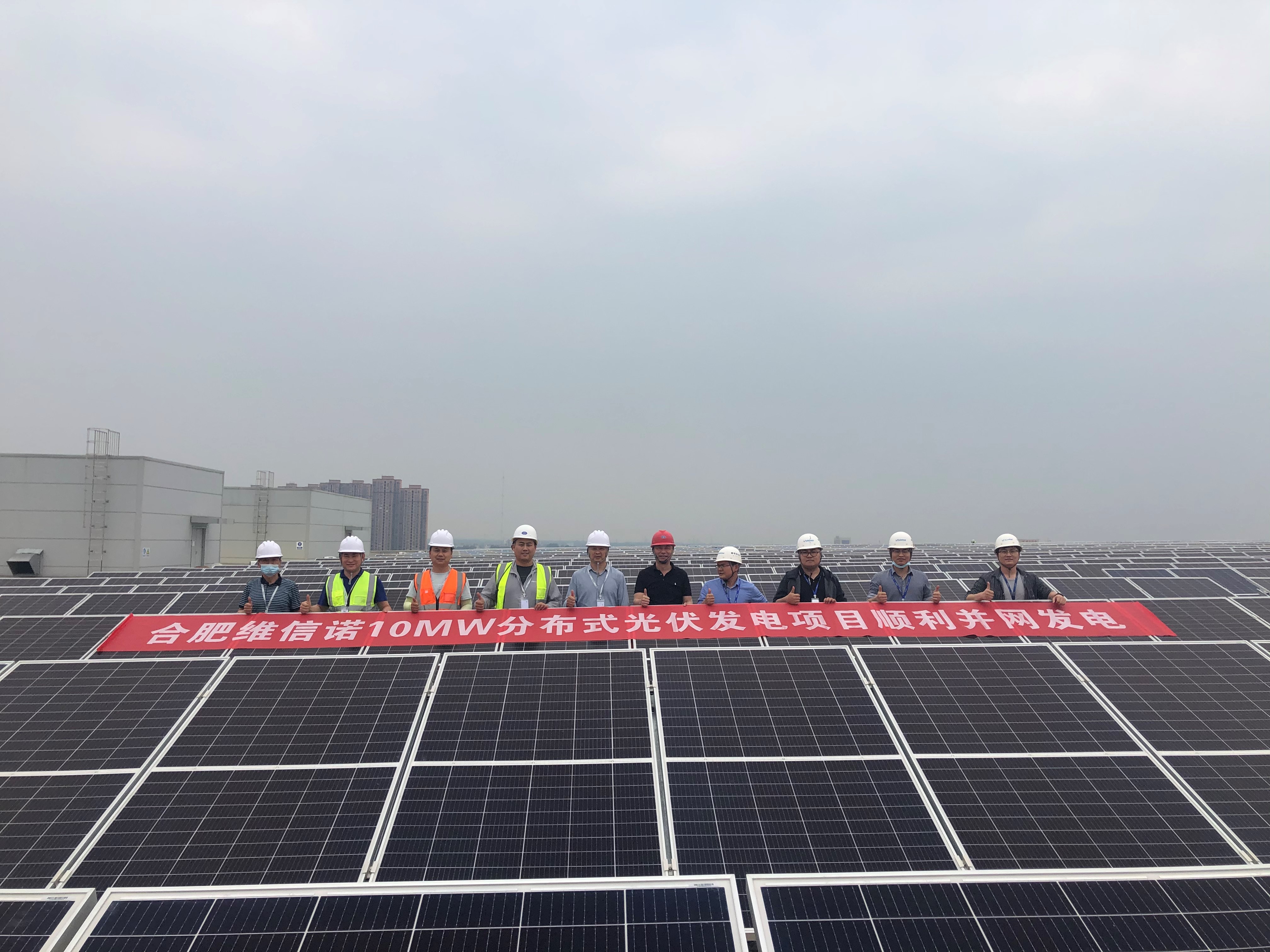 该项目利用了新站区合肥维信诺有限公司1#、2#厂房屋顶,设计装机总容量为10.53兆瓦,总投资3711万元。项目于2021年1月份正式进场施工,在金太阳公司及参建各方的共同努力下,用时130余天顺利完成了设备安装、调试及并网验收等工作,进入全容量并网发电试运行阶段。